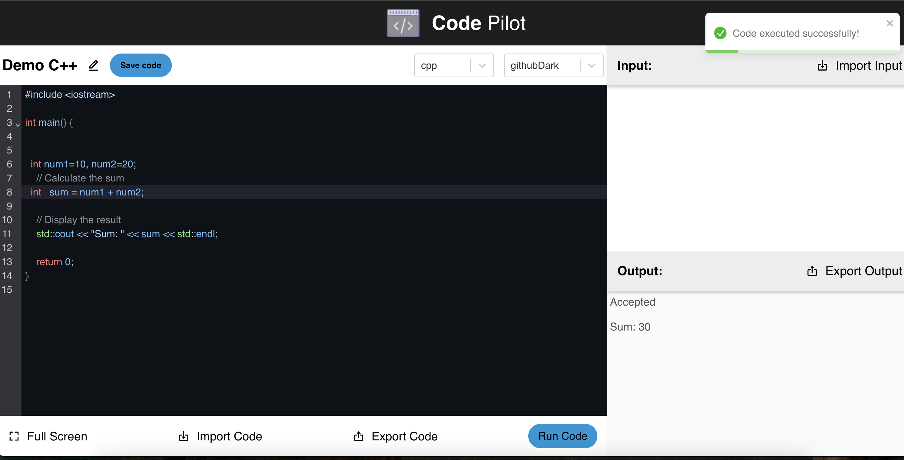CodePilot is a modern, web-based multi-language online compiler and editor built with React and powered by Vite, designed to provide developers with a seamless and efficient coding environment. Supporting popular programming languages such as JavaScript, Python, Java, and C++, it allows users to write, execute, and debug code directly in the browser without the need for local setup. With its customizable themes like Dracula, VS Code, and GitHub, developers can personalize their workspace to match their preferred style, while its real-time feedback system ensures instant execution and output for a smooth workflow. The platform's sleek and responsive modern UI, crafted with styled-components, enhances usability and provides a professional coding experience. Navigation is made effortless with react-router-dom, enabling smooth transitions between sections, while react-toastify integration keeps users informed with timely alerts and notifications. Whether for learning, testing, or quick prototyping, CodePilot simplifies the coding process by combining power, flexibility, and user-friendly design in a single platform.